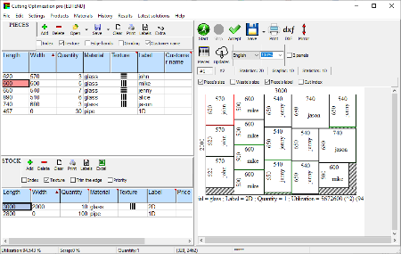 Cutting Optimization Pro is a cutting software used for obtaining optimal cutting layouts for one (1D) and two (2D) dimensional pieces. The software also lets you to define and handle complex products, such as table, desk, cupboard, locker, book shelf.