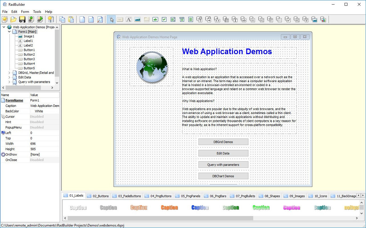 With RadBuilder you can create standalone Web applications exactly the same way you would create normal database applications. It is a revolutionary new way to create web-based applications. The standalone Web application is a web server that run without dependencies from any other web server (IIS or Apache).