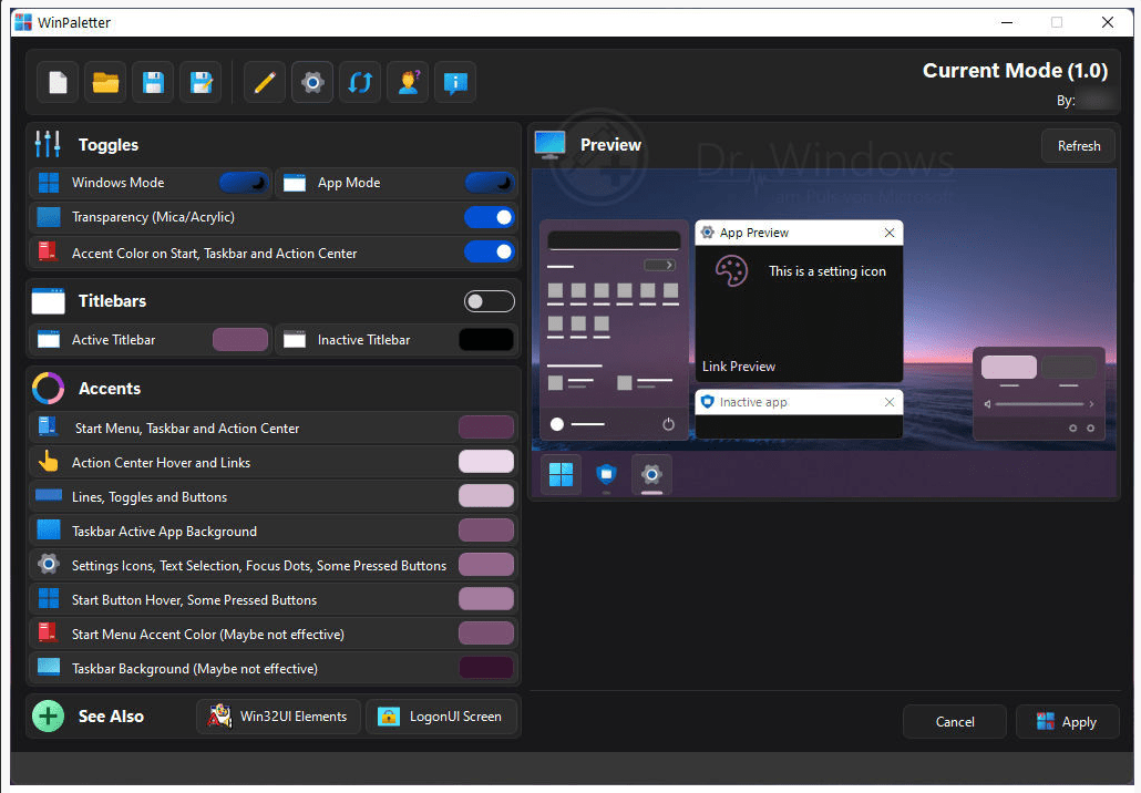 Personalization of your Windows computer is made easy with WinPaletter; it provides you with the ability to change almost every aspect of the way your desktop appears. The interface is modern and lists the options for color changes for title bars, accents, and more. Preview the changes before committing to avoid clashes in color schemes.