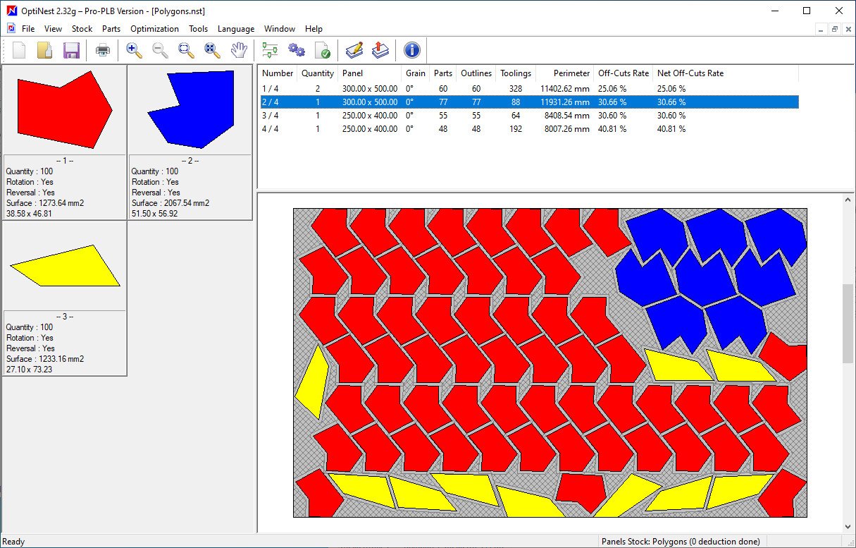 OptiNest is a general shapes nesting sofware, based on a powerful algorithm using the BOOLE & PARTNERS CalepiLib functions library. OptiNest's main standard parameters are calculation depth, smoothing factor, pieces grouping, and propagation mode.