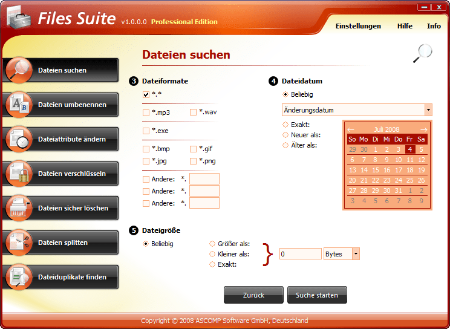 Files Suite: Dateien suchen, umbenennen, löschen und verschlüsseln. Mit Files Suite ausgestattet werden Sie ein Meister der Dateimanipulation: insgesamt sieben Utilities stellen Ihnen unter leicht bedienbarer Oberfläche häufig benötigte Funktionen zur Verfügung, die Ihren Datenbestand nicht nur schneller, sondern auch sicherer machen.