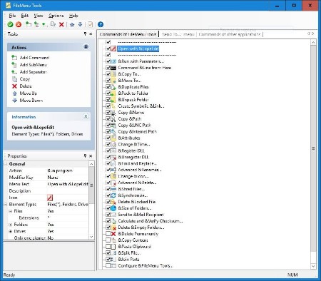 FileMenu Tools allows you to add commands, submenus and separators, as well as remove entries from the list. But you can also reconfigure general properties when it comes to the action, menu text, description, icon, element types, file extensions, folders, drives, modifier keys, arguments, working folder, multiple instances, and administrative mode.