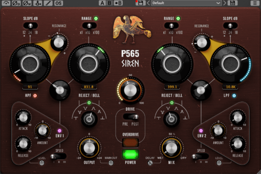 P565 Siren features high and low pass filters with selectable slope and tunable musical resonance that brings you into the realm of some of the most sought after resonant filters and beyond. It also features two notch/peak filters designed for precise adjustment and creative expression. Each of these filters can be dynamically modulated based on an external input signal or the built-in dual envelope followers with fine control over attack, release, amount and speed characteristics. These features accumulate to a powerful creative use that ranges from subtle movement to funky rhythmic enhancement while still covering phasing, flanging and resonance sweeps.