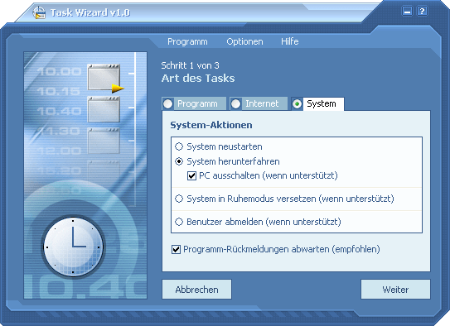Task Wizard ist ein Allround-Tool zur Planung und Realisierung von Tasks (Aufträgen). Die unkomplizierte Benutzerführung erlaubt ein einfaches und schnelles Erstellen von Aufträgen folgender Arten