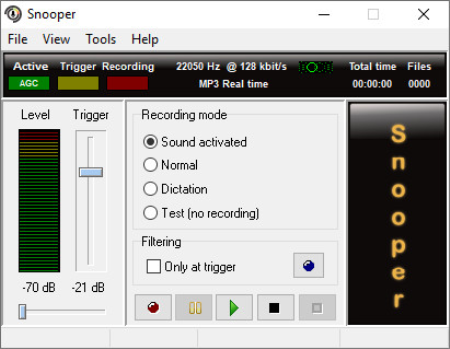 Snooper is an advanced sound recorder to your computer with many options and features. Recording automatically starts when sound is detected from the microphone input and stops when there is silence. After the recording is done the audio file can automatically be sent by e-mail. You can also create voice mail with the integrated voice mail function. Using compact MP3 audio format the file size will be less than 4 MB for one hour of recording. Recordings can be set to start and stop at different s. Stealth mode will hide the program from the taskbar and tray.
