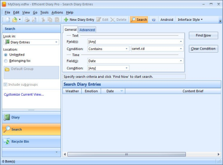 Efficient Diary has full-text search capabilities so you can quickly find your information. You only need to input any related information in the text box of Condition and press Enter.