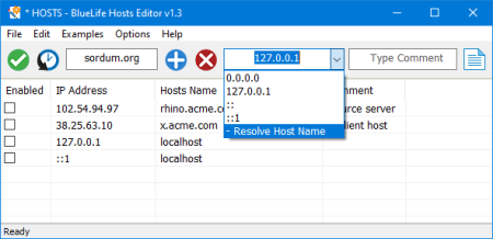 Bluelife hosts editör is a Portable Freeware hosts-file editor and Allows you to easily add/delete , Block , Update domain names to your hosts file , Simply type the hostname you wish to add in the first box and Select resolve domain names from the drop down menu then add in to the list with plus button