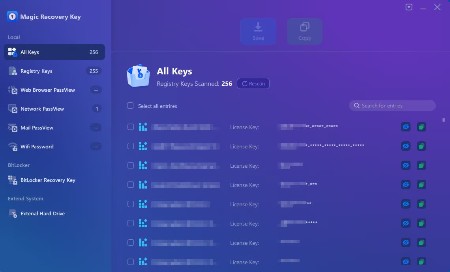 Magic Recovery Key, a potent tool, easily locates Windows and Windows Server product keys. It swiftly retrieves licenses during system or hard disk failures and restores keys for over 10,000 popular programs, ensuring software stays fully licensed and operational. Additionally, it can extract BitLocker keys to unlock computers, adding convenience and security for encrypted drives and access problems.