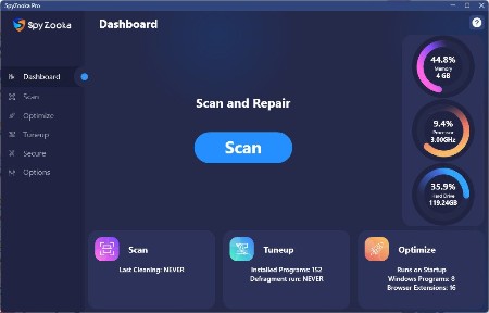 Underneath these gauges, you'll find three of the most relevant options. You can scan your machine for threats and then issue a repair command for the found inconsistencies, use the Tuneup option to improve your machine's capabilities, and then have your machine constantly optimized by scheduling a simple action on startup.