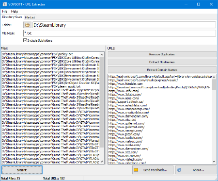 The software scans an entire folder for files that contain links and displays them all within its main window, allowing you to export the list to file. All the options are clear and simple and they all can be placed within the one-window interface. All you need to do is select the files you want the application to analyze and press the "Start" button. Vovsoft URL Extractor supports file masks to help you filter the files.