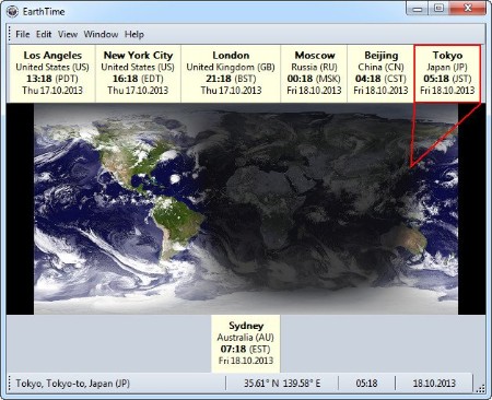 EarthTime displays the local time and date of any place in the world. It has a built-in database of thousands of cities worldwide but users can add any number of custom locations. EarthTime shows a map of the earth with daylight and night shadows and optionally a cloud layer with current satellite cloud data. Alarms can be set on the local time of any city in the world. Many options allow flexible customization.