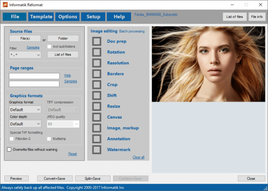Informatik Reformat is a universal graphics reformatting and transformation utility, an ideal tool for document management and document imaging systems. Reformat supports single and multipage TIFF files of various compressions (and over 20 current and legacy graphics formats). The interactive program allows you to batch process selected files, entire directories, even nested subfolders. Included is a utility to convert Tiff files to PDF.