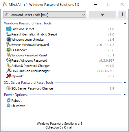 Useful collection to solve passwords problems, Reset Windows XP-10 Local or Admin Account Passwords, Temporary Bypass Local or Microsoft (online) account Passwords, Reset Active Directory Account or Domain Cached Passwords., Create New Users and Many more (Explore your self).