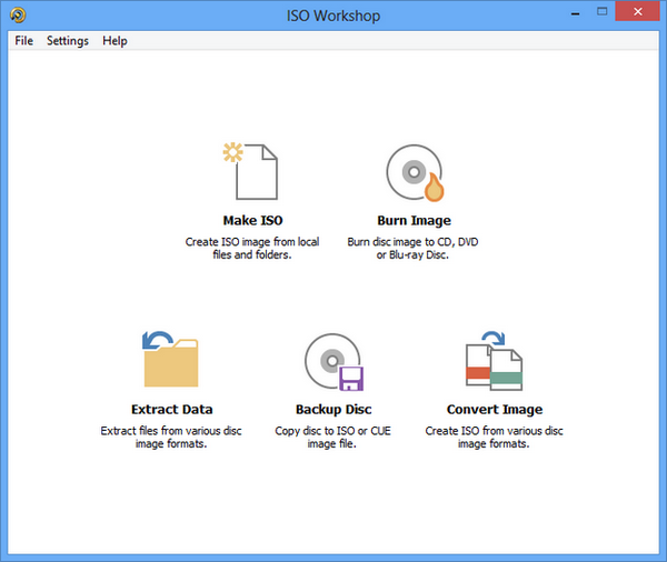 ISO Workshop is a application specifically designed to facilitate disc image management, conversion and burning operations. The program has a very simple user interface and enables you to make ISO images, extract specific files and folders from disc images, create disc backups by copying disc contents to an ISO or BIN image file, convert different disc image files into the ISO or BIN format and, of course, burn ISO and CUE images to blank discs.