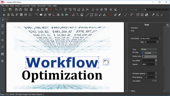 With Master PDF Editor you can add text with any formatting to a PDF document or edit existing text. You can also insert images to the document, select and move objects, change the size of objects, save images to a file and copy objects them to the clipboard.