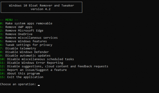 Windows 10 Bloat Remover and Tweaker is a tool designed to help you remove bloatware and disable certain features that usually take up space and sometimes affect the overall functionality of the system. The application is a CLI tool and hence, does not require installation. In case you want to configure it, then you can do so from the JSON file created after the first launch.